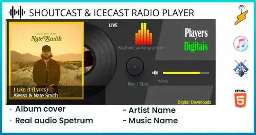 SHOUTcast & Icecast Compatible with SHOUTcast DNAS 1/2 & Icecast 2. Native Browser Code Built in pure HTML5, CSS, jQuery. No Server-side script needed. HTTPS support Works over ssl (https)…